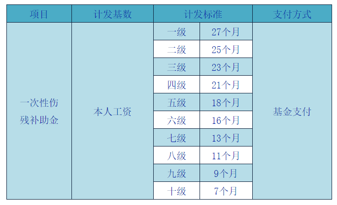 注:(1)职工负伤一次给予其一次补偿,而负伤后因伤复发导致伤残等级发生的变化的,不再支付给职工一次性伤残补助金。(2)用人单位未给工伤职工参加工伤保险的,由用人单位支付。