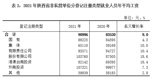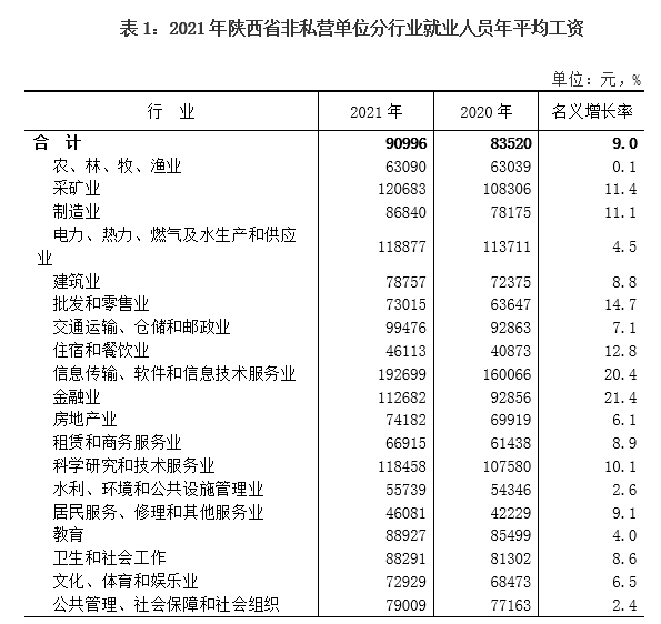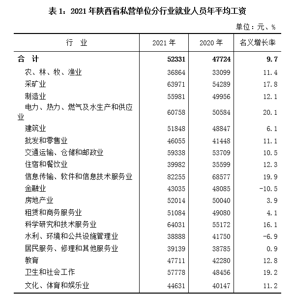 (二)陕西省统计局2022年5月31日公布的《陕西省2021年非私营单位分行业就业人员年平均工资》(见下图)